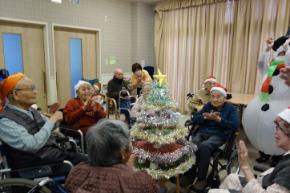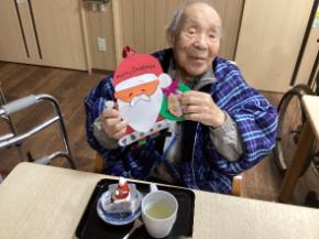 クリスマスソングを歌ったり、ジャンケンゲームでは勝ち残った2名の方に靴下をプレゼントしました。皆さまニコニコで大いに盛り上がりました。昼食はオムハヤシ・チキンナゲット・コーンスープとボリュームがありましたが皆さま完食されました。3時のおやつには、ご自分で作ったケーキを紅茶と共に召し上がって頂き、その後サンタさんよりクリスマスプレゼントをもらい、一日中楽しんだクリスマス会でした。
