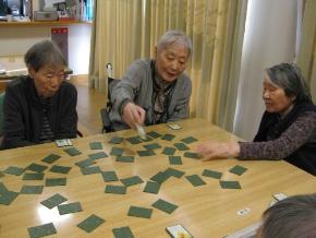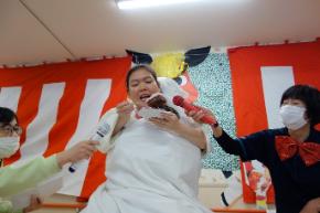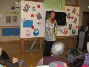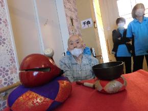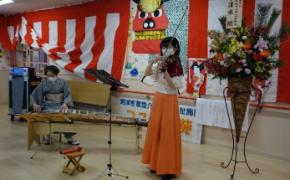 お正月にふさわしい、優雅なひと時でした。職員も張り切って、二人羽織でケーキを食べたり、きれいに?お化粧をして、笑いと拍手を頂きました。